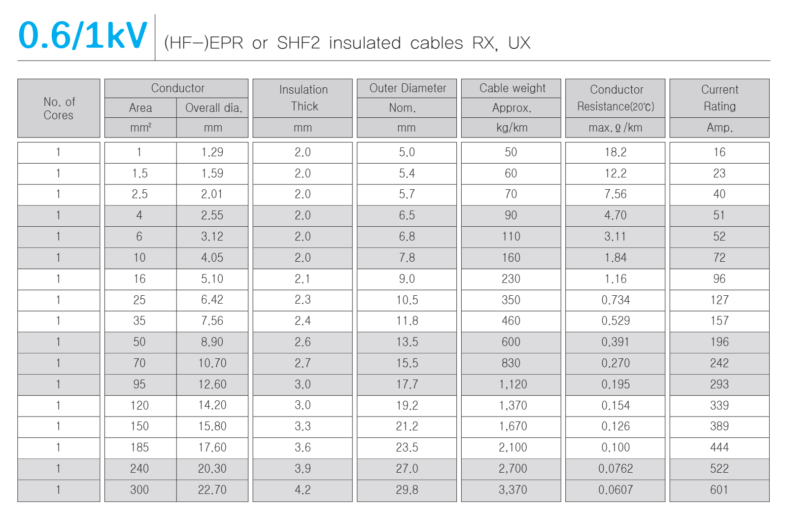 Conductor Resistance(20℃ ) max. Ω/km : 1mm2 >> 18.2 ; 1.5mm2 >> 12.2 ; 2.5mm2 >> 7.56 ; 4mm2 >> 4.70 ; 6mm2 >> 3.11 ; 10mm2 >> 1.84 ; 16mm2 >> 1.16 ; 25mm2 >> 0.734 ; 35mm2 >> 0.529 ; 50mm2 >> 0.391 ; 70mm2 >> 0.270 ; 95mm2 >> 0.195 ; 120mm2 >> 0.154 ; 150mm2 >> 0.126 ; 185mm2 >> 0.100 ; 240mm2 >> 0.0762 ; 300mm2 >> 0.0607